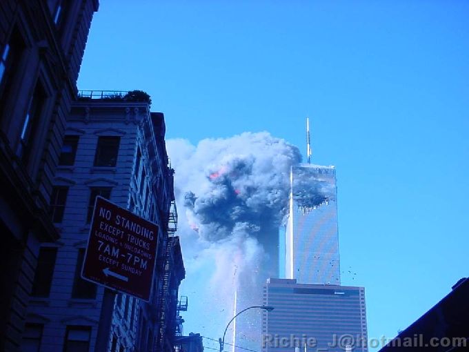 This was seconds after the 2nd plane crashed into the south tower. Since the plane came from the other side, I did not know it was coming. Even from six blocks away, you could feel the hear from the explosion. |
